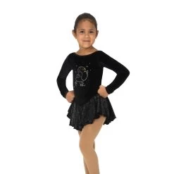 A crystal skating penguin sparkles on this black velvet dress with long sleeves, a twinkle velvet skirt and twinkle velvet trim around the neck and scoop back.