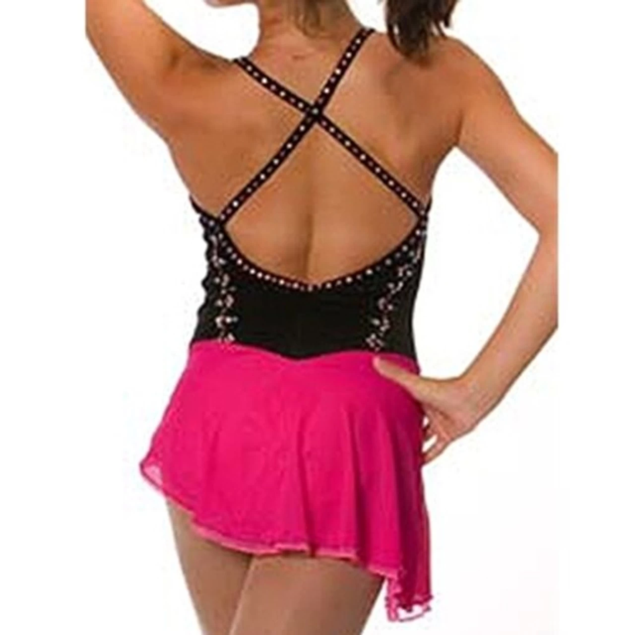 Updated lace & velvet corset dress perfect for your Spanish influenced freestyle program. (Bodice secured with nude mesh inserts.) Angled double mesh 2-color contrast skirtâfor a âflipâ of color. Strappy back.