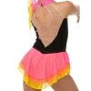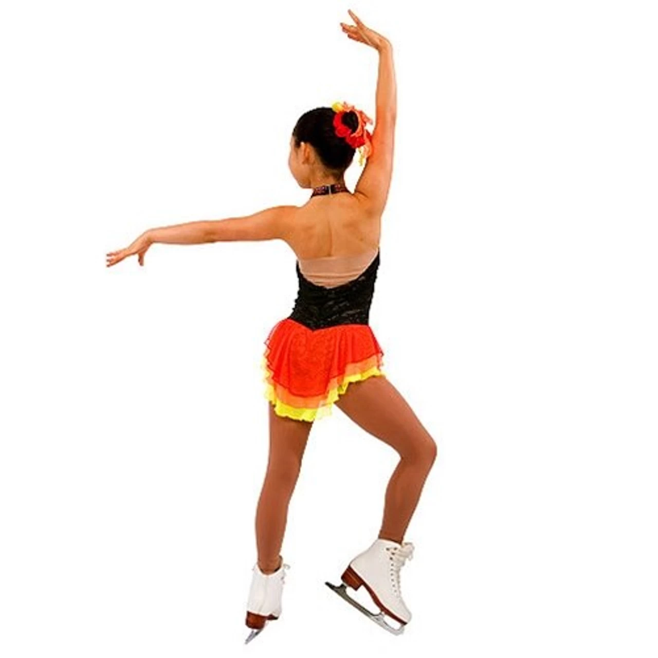 Flirty Spanish-styled dress for all ages. Softly gathered lace front bodice looks risque’ (but really isn’t with nude lining underneath). Low “V” neck supported by nude mesh. Halter hooks at back of neck with nude support across low, low back. Triple-layer skirt of stretch illusion mesh.