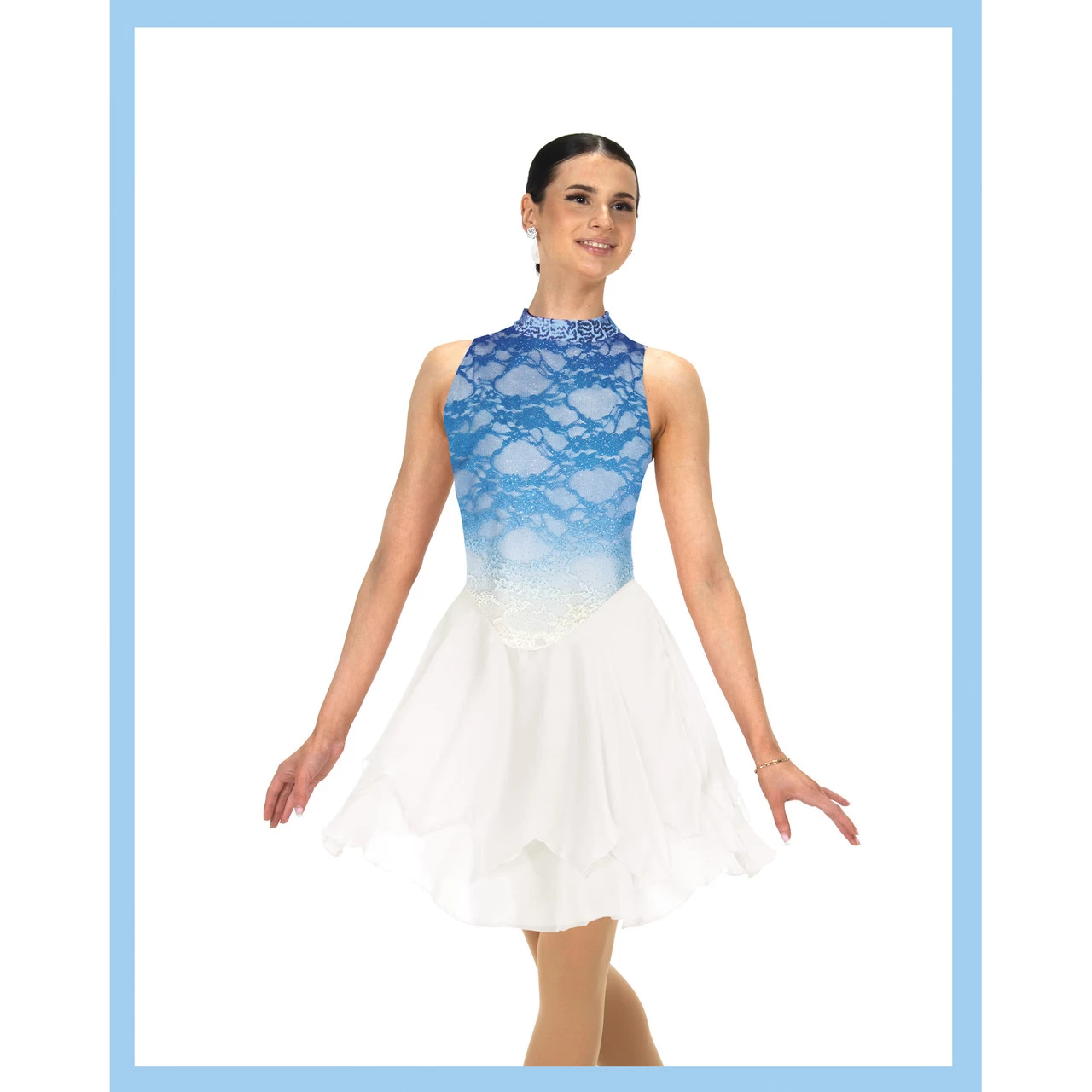 This dress features a shaded blue glitter lace that blends to white at the waist and a double georgette skirt edged in silver with a tulip hem top skirt. Lined.