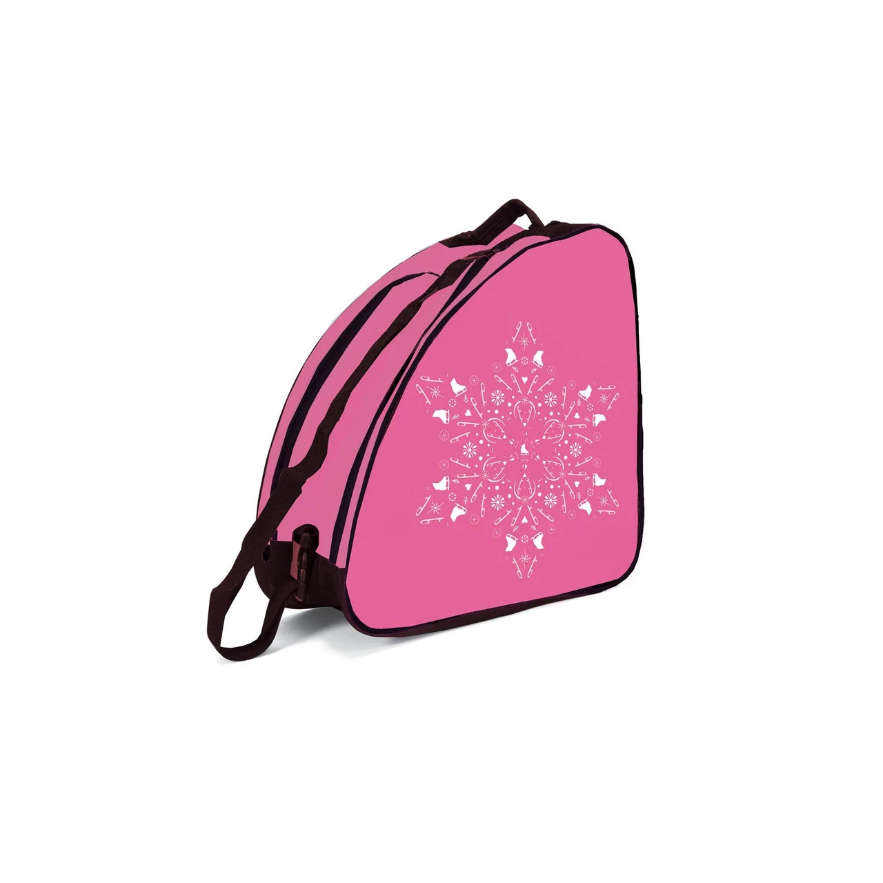 A single skate bag in a wider and roomier size to accommodate extra gear, and featuring our silvery skate and blade snowflake design. Wide opening zipper front, adjustable shoulder strap, top carrying handle and reinforced bottom to protect against sharp blades.
