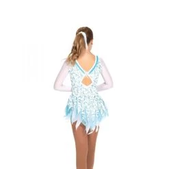 Snow white velvet dress frosted all over with swirls of silver and ice blue. Long glitter mesh sleeves, a swishy, feathery fringe skirt and V-shaping at the front and a diamond locket back add sophisticated touches. Lined.