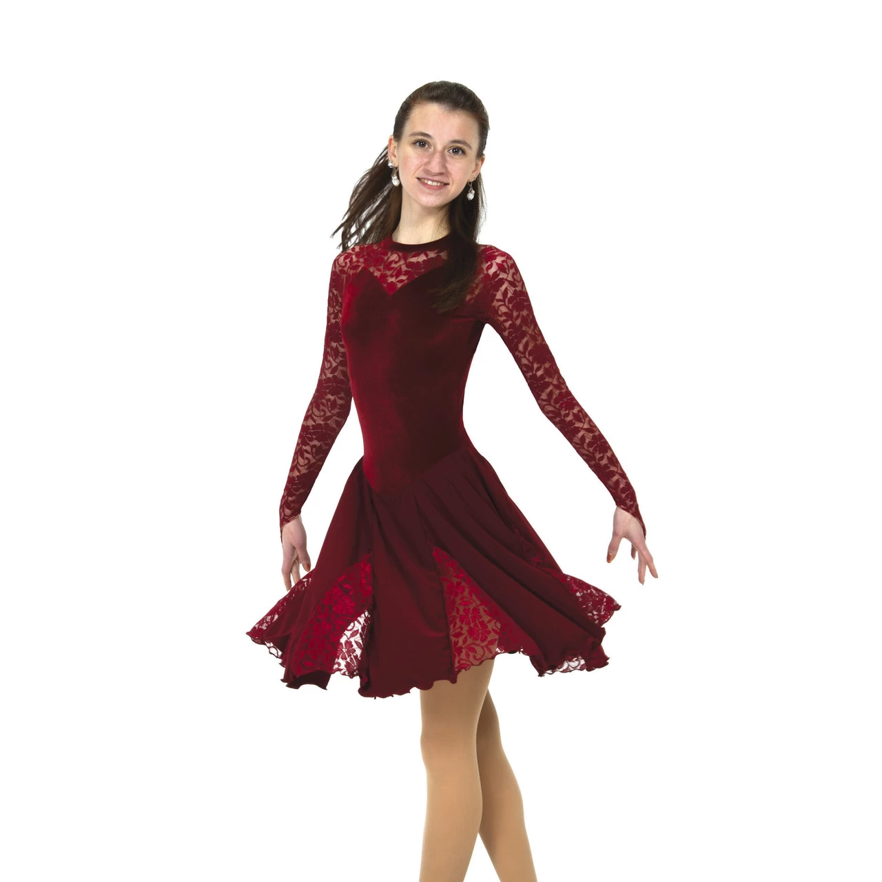 Classically styled velvet dress with long lacy sleeves, a sweetheart shaped front, slim back keyhole and flowy skirt inset with lace accents.