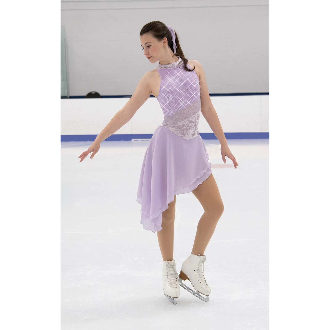 Flowy and feminine, these lilac dance dresses take a step off the beaten path with layered, slanted skirts and angled asymmetrical crystal bursts accented with a band of subtle glitter. Lined.