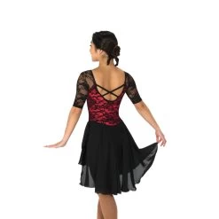 Classic lace dress with elbow length sleeves, a jewel neckline and scoop back with a pair of crossed spaghetti straps. Lined.