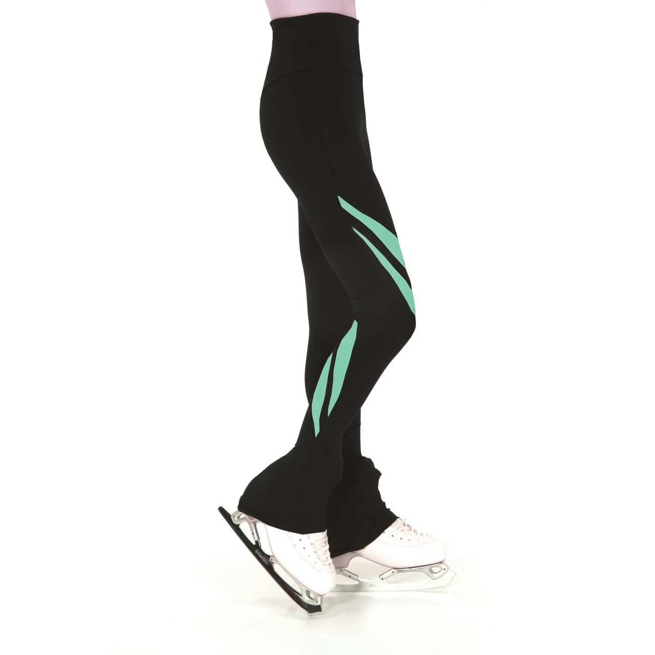 High waist black supplex leggings are moisture wicking and quick drying, and feature a long under-the-heel fit and whorl of colour on one leg.