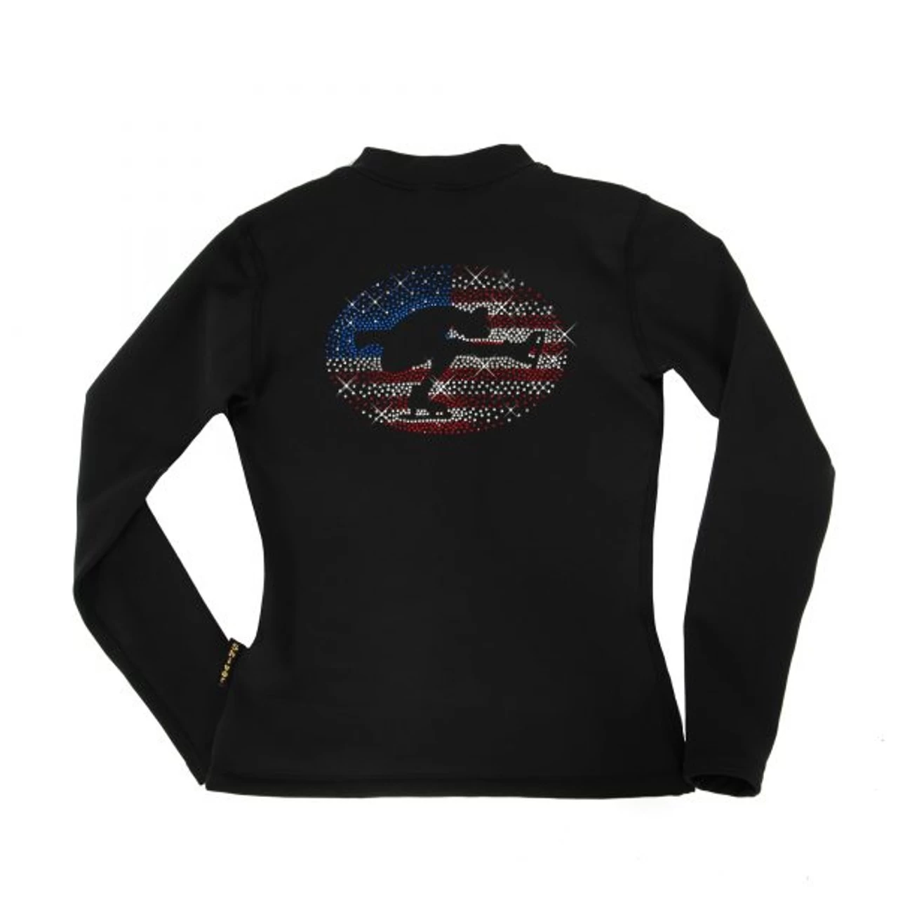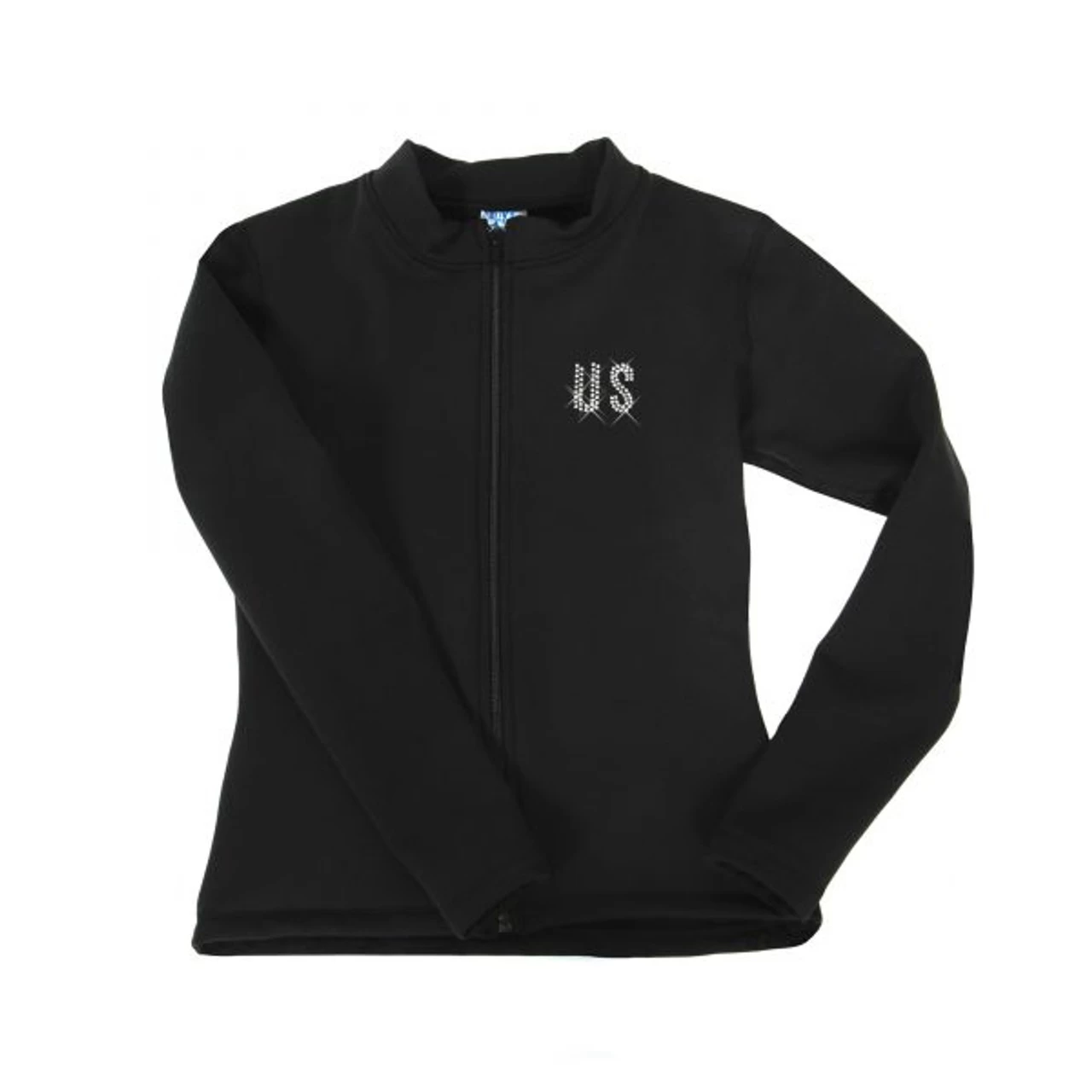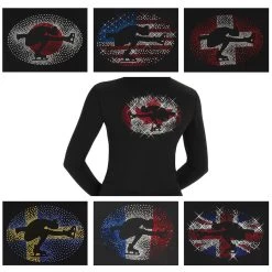 Jerry’s Skating World brings the world to figure skaters in every country. Flaunt your flag in our power fleece jacket with sparkling crystals outlining a sit spin silhouette against flags of all countries at the back.