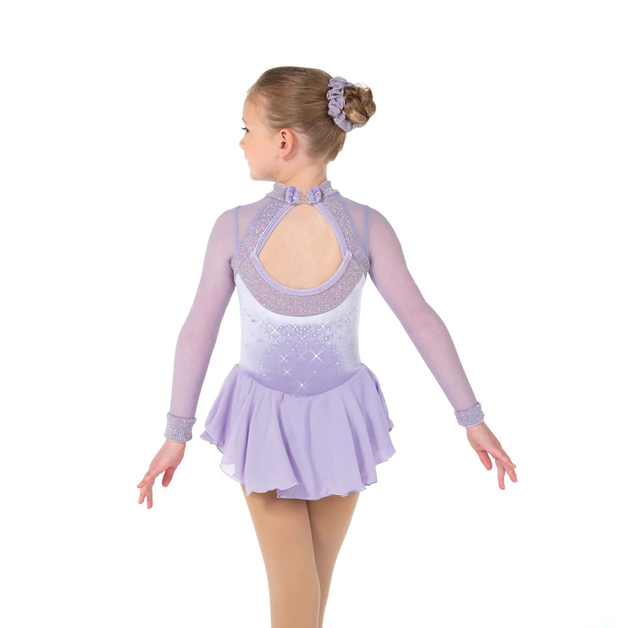Soft purple velvet dress with long mesh sleeves and a rounded neckline trimmed in iridescent glitter, plus a matching filmy skirt and sparkling iridescent crystals. Lined.
