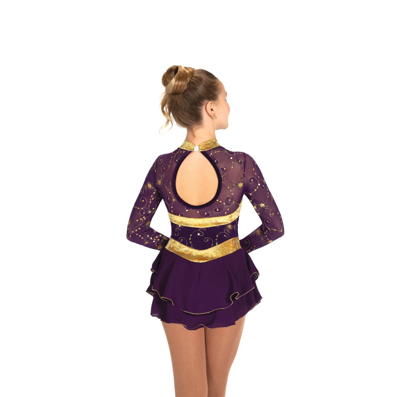 Deep purple mesh is tastefully embroidered with gold sequins and teamed with gold trim to create a sophisticated style. Classic back keyhole and double layer skirt edged in gold. Lined.