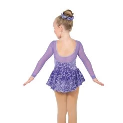 Swirls of icy silver glitter sparkle against soft velvet in these pretty dresses. High front neck with scoop back, long mesh sleeves and a full glitter skirt.