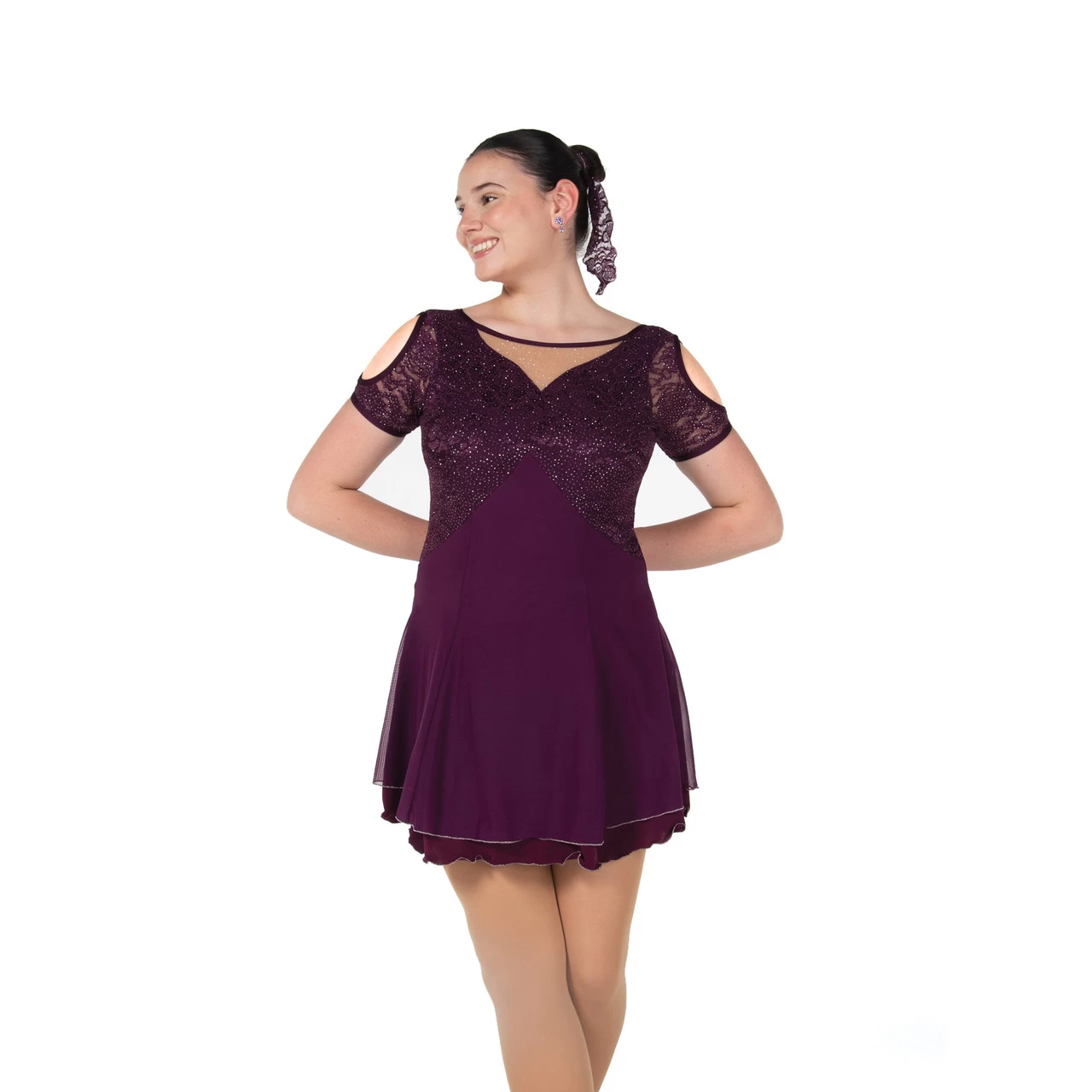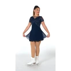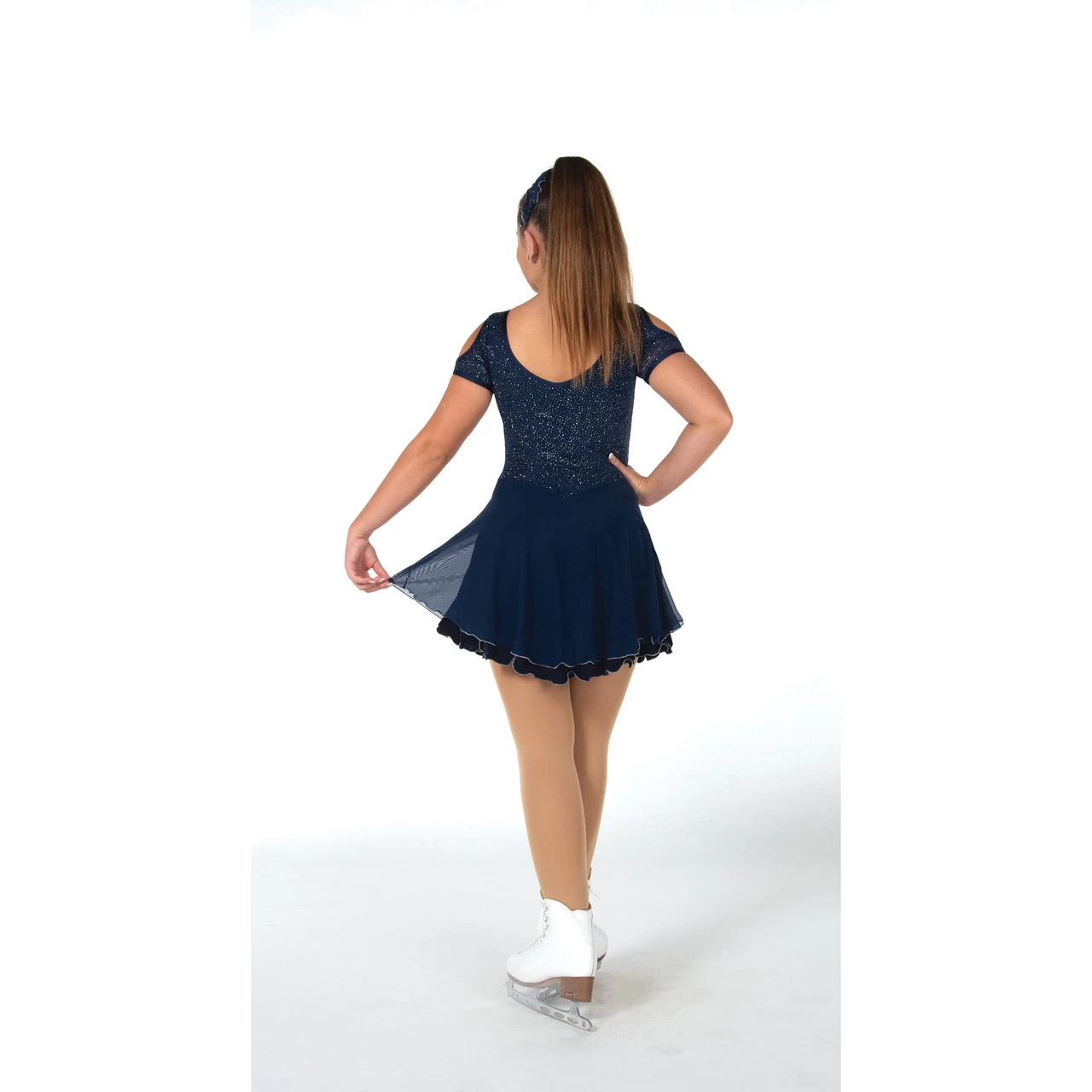 Glitter lace dresses in a flattering empire cut with lovely cap sleeves set with keyholes, a shaped front neckline, scoop back and double layer skirt of sheer mesh over an opaque knit. Lined in matching lycra.