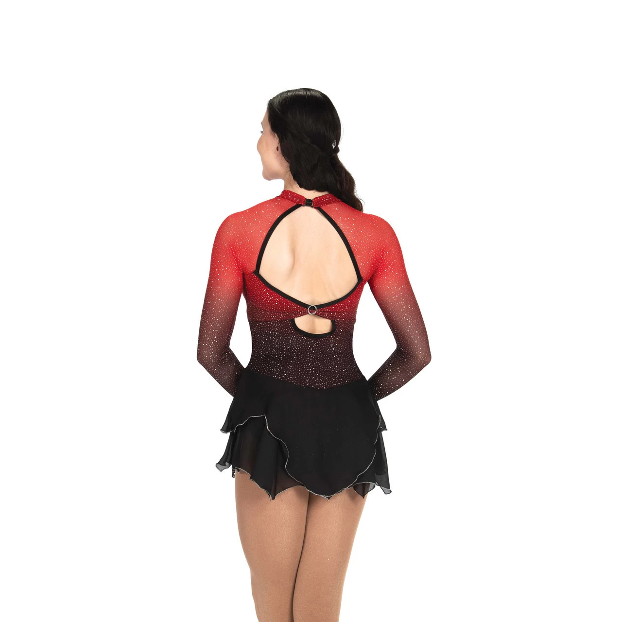 Beautiful glitter mesh dress that shades from ruby red at the neck and shoulders to coal black at the waist. Shaped georgette skirt and finger points. Lined.