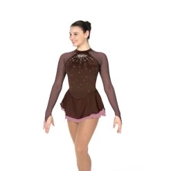 Sophisticated mahogany lycra dress with a back statement keyhole, long mesh sleeves with finger points and a matching double layer skirt of mahogany brown over rose. A cascade of crystals flows from large clear stones at the neckline through petal pink and down to diminutive rose crystals at the waistline. Lined.