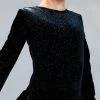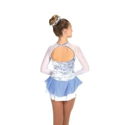 The luxuriously soft icy velvet of these dresses’ pairs perfectly with snowy white glitter mesh that sweeps across the shoulders and down the long sleeves. Crystal accents add sparkle to the front, and an elliptical keyhole adds interest to the back.