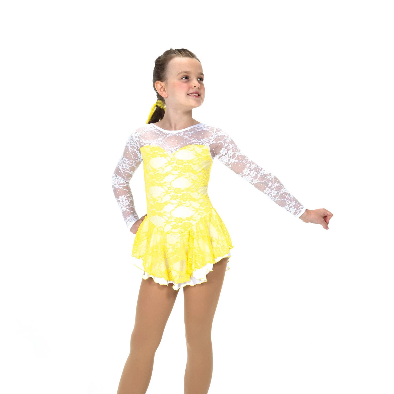 Clean snow white glitter lace is paired with crisp, bright coloured laces and cut in a pretty sweetheart front and dipped V-back. Long glitter lace sleeves and a glitter lace top skirt add classic touches. Lined.