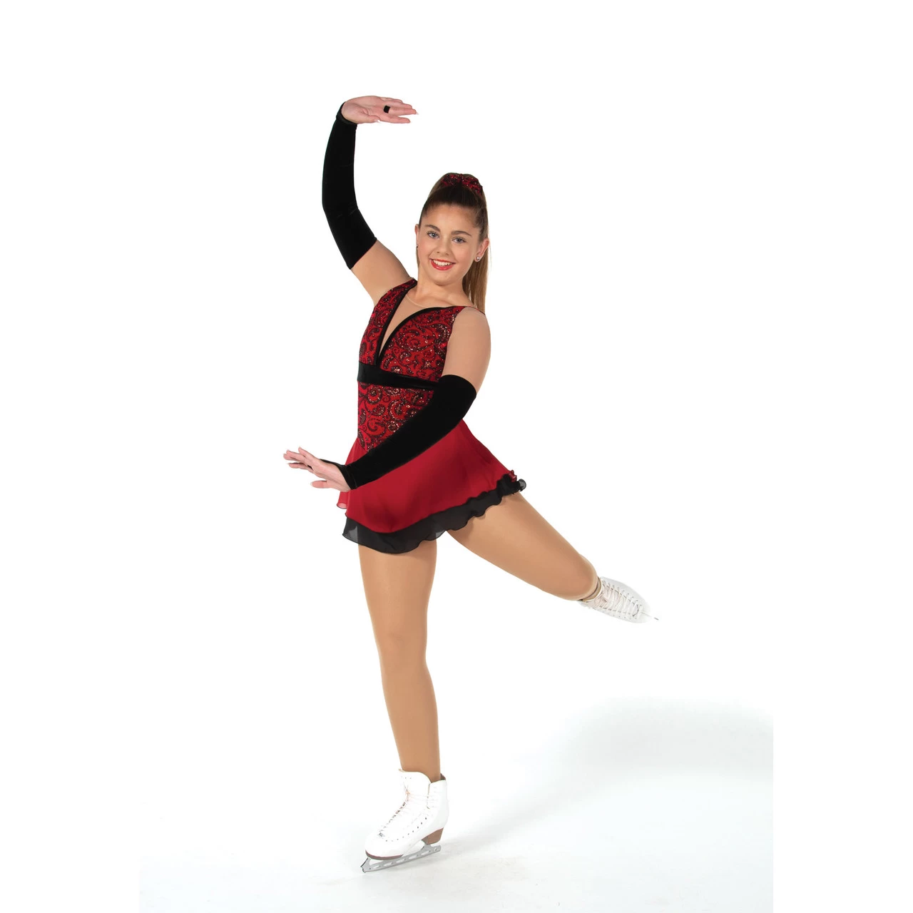 Put on your black gloves and skate like a muse in this gorgeous red velvet dress with jet and copper glitter swirls. Velvet trimmed front V-neck, V-shape back, glove style sleeves and a double georgette skirt of ruby red over black that echoes the banding of the bodice. Lined front.