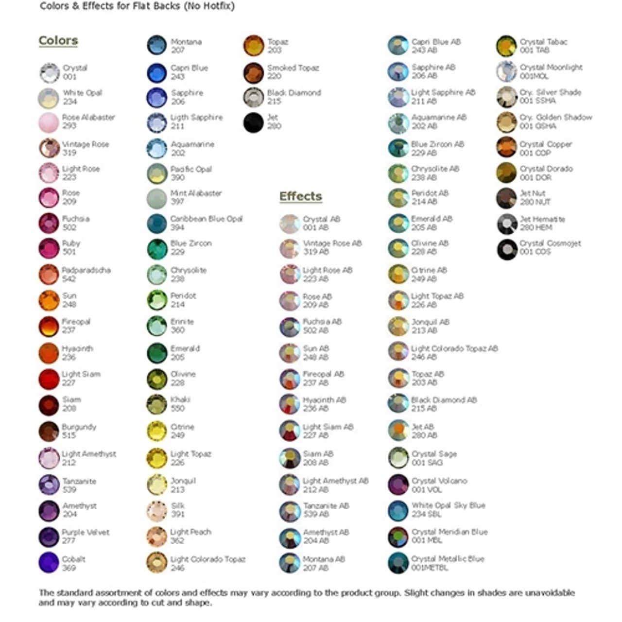 | Color | Clear, Clear AB, Padparadscha, Sun, Citrine, Topaz, Dorado, Voolcano, Lt. Rose, Rose, Amethyst, Tanzanite, Aqua, Capri Blue, Metallic Blue, Montana Blue, Meridian Blue, Lt. Sapphire, Sapphire, Emerald, Peridot, Lt. Siam, Siam, Tobac, Jet, Hematite, Black Diamond, Fuschia, Fuschia AB |